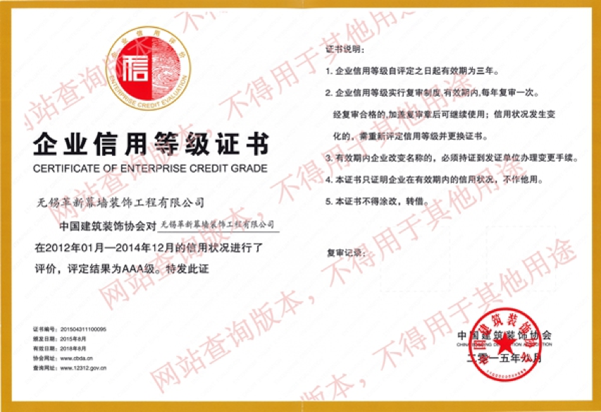 喜訊:熱烈祝賀我公司榮獲2015年中國建筑裝飾協(xié)會(huì)AAA級(jí)企業(yè)信用等級(jí)證書