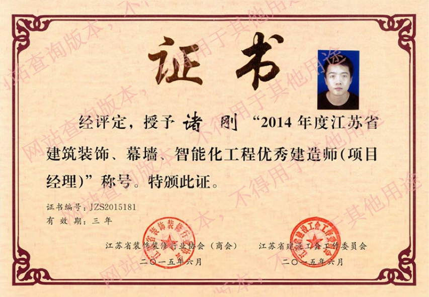 喜訊:熱烈祝賀我公司諸剛同志榮獲“2014年度江蘇省建筑裝飾、幕墻、智能化工程優(yōu)秀建造師(項(xiàng)目經(jīng)理)”稱號(hào)