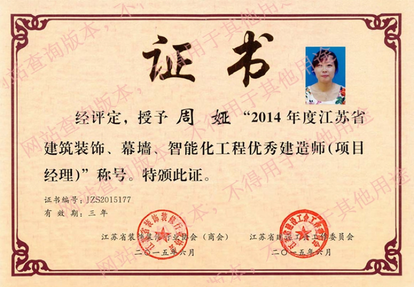 喜訊:熱烈祝賀我公司周婭同志榮獲“2014年度江蘇省建筑裝飾、幕墻、智能化工程優(yōu)秀建造師(項(xiàng)目經(jīng)理)”稱號(hào)