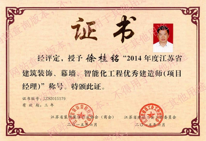 喜訊:熱烈祝賀我公司徐桂銘同志榮獲“2014年度江蘇省建筑裝飾、幕墻、智能化工程優(yōu)秀建造師(項目經(jīng)理)”稱號