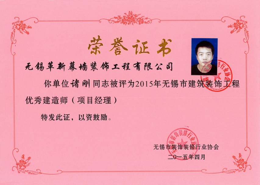 喜訊:熱烈祝賀我公司諸剛榮獲了2015年無錫市建筑裝飾工程優(yōu)秀建造師(項目經(jīng)理)