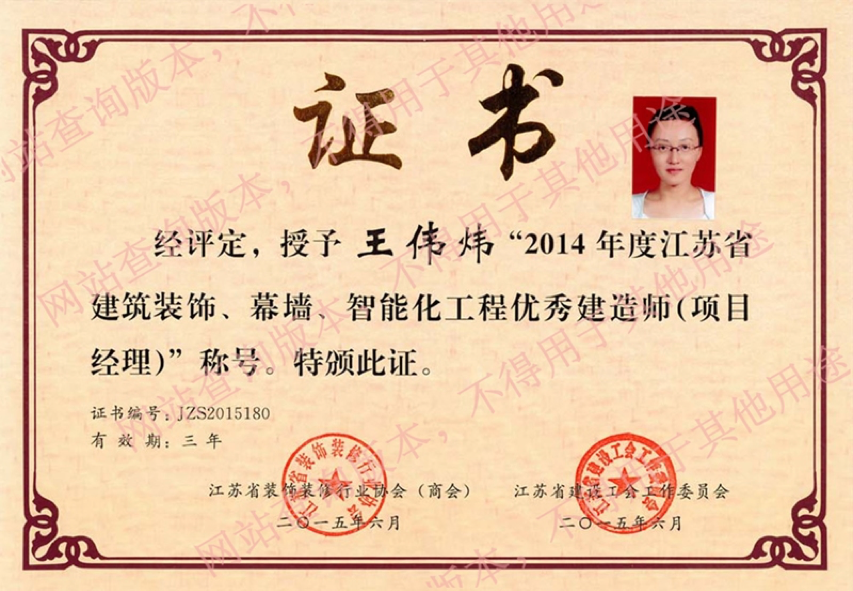 喜訊:熱烈祝賀我公司王偉煒同志榮獲“2014年度江蘇省建筑裝飾、幕墻、智能化工程優(yōu)秀建造師(項目經(jīng)理)”稱號