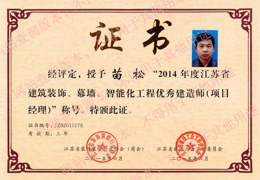 喜訊:熱烈祝賀我公司苗松同志榮獲“2014年度江蘇省建筑裝飾、幕墻、智能化工程優(yōu)秀建造師(項目經(jīng)理)”稱號