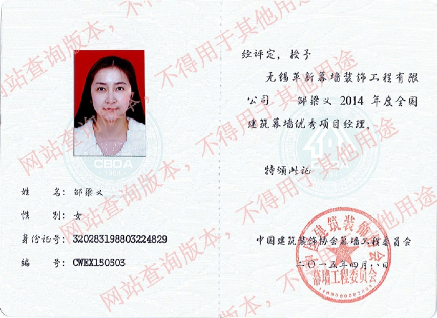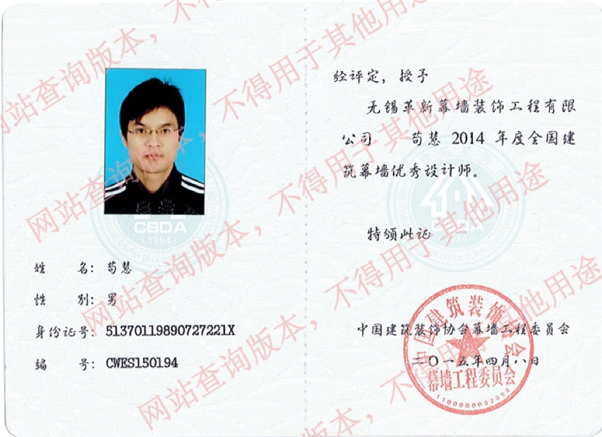 喜訊:熱烈祝賀我公司茍慧同志榮獲2014年全國建筑幕墻(幕墻委員會)優(yōu)秀設計師