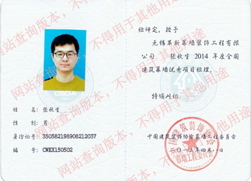 喜訊:熱烈祝賀我公司張秋生同志榮獲2014年全國建筑幕墻(幕墻委員會)優(yōu)秀項目經(jīng)理