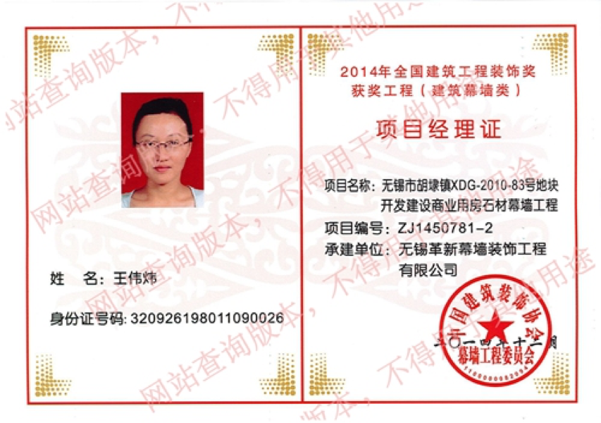 喜訊:熱烈祝賀我公司王偉煒同志榮獲2014年全國建筑工程裝飾獎(幕墻委員會)優(yōu)秀項目經(jīng)理
