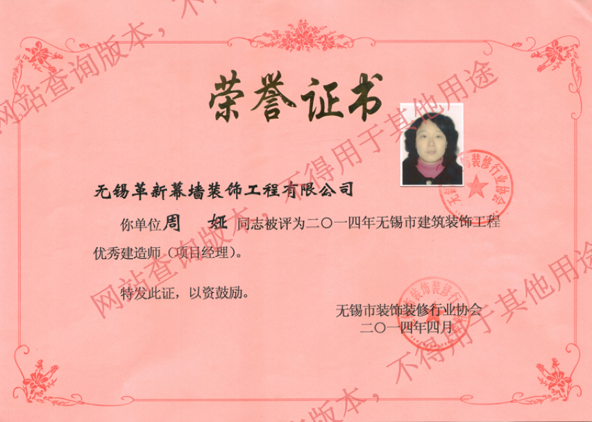 喜訊:熱烈祝賀我公司周婭同志獲“2014年無(wú)錫市建筑裝飾工程優(yōu)秀建造師(項(xiàng)目經(jīng)理)”稱號(hào)