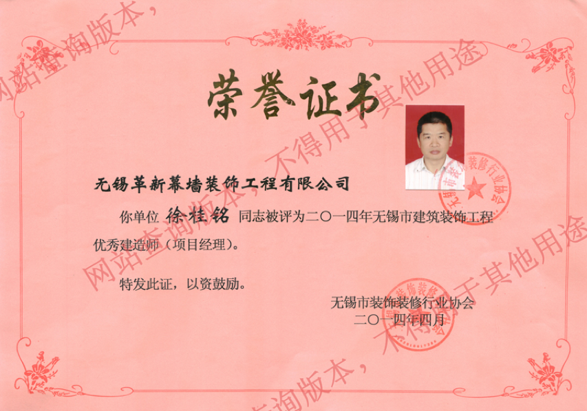 喜訊:熱烈祝賀我公司徐桂銘同志獲“2014年無(wú)錫市建筑裝飾工程優(yōu)秀建造師(項(xiàng)目經(jīng)理)”稱號(hào)