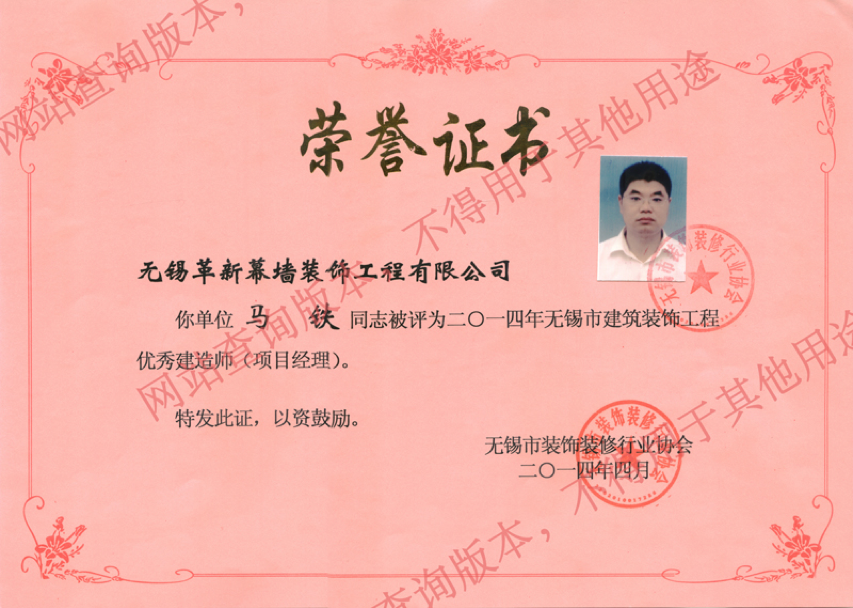 喜訊:熱烈祝賀我公司馬鐵同志獲“2014年無錫市建筑裝飾工程優(yōu)秀建造師(項目經(jīng)理)”稱號