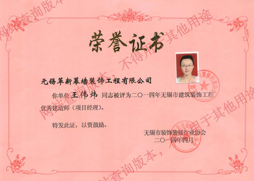 喜訊:熱烈祝賀我公司王偉煒同志獲“2014年無錫市建筑裝飾工程優(yōu)秀建造師(項目經(jīng)理)”稱號