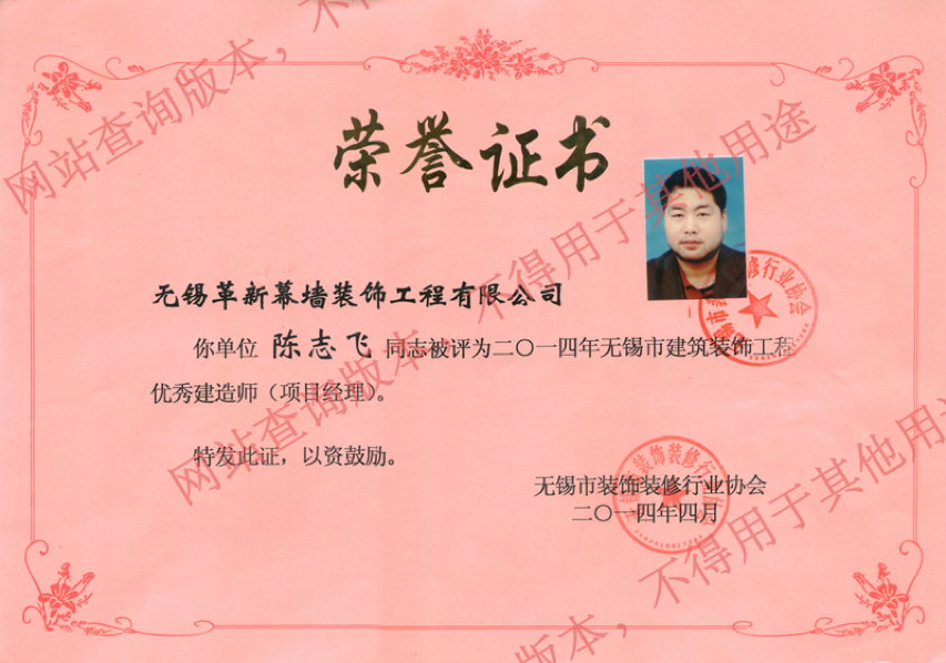 喜訊:熱烈祝賀我公司陳志飛同志獲“2014年無錫市建筑裝飾工程優(yōu)秀建造師(項目經(jīng)理)”稱號