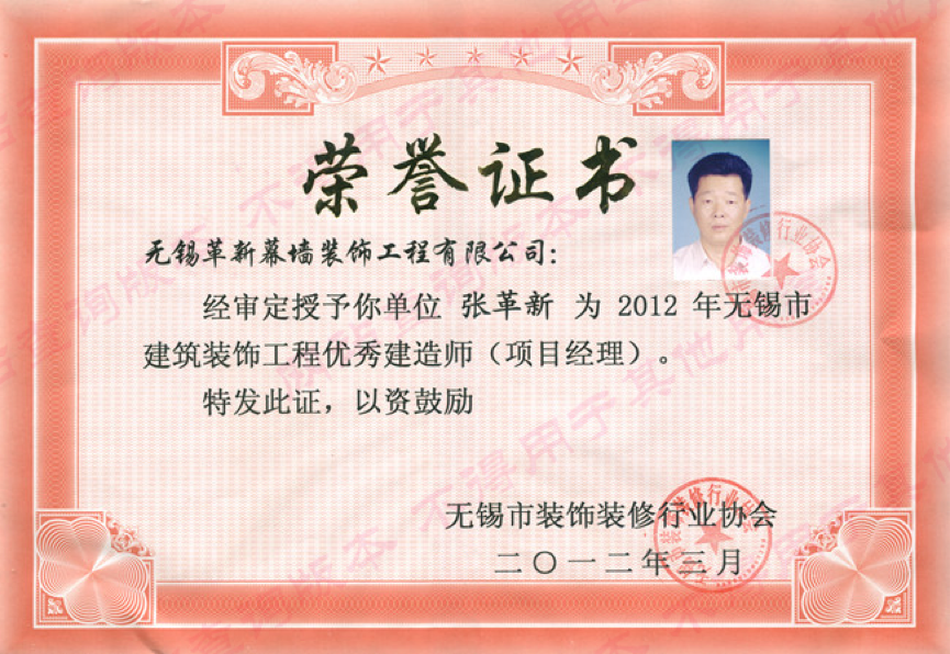 喜訊:熱烈祝賀我公司法定代表人張革新同志獲“2012年無錫市建筑裝飾工程優(yōu)秀建造師(項目經理)”稱號