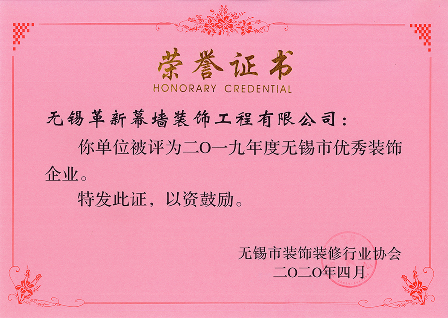 喜訊:熱烈祝賀我公司榮獲2019年度獲得無錫市優(yōu)秀裝飾企業(yè)