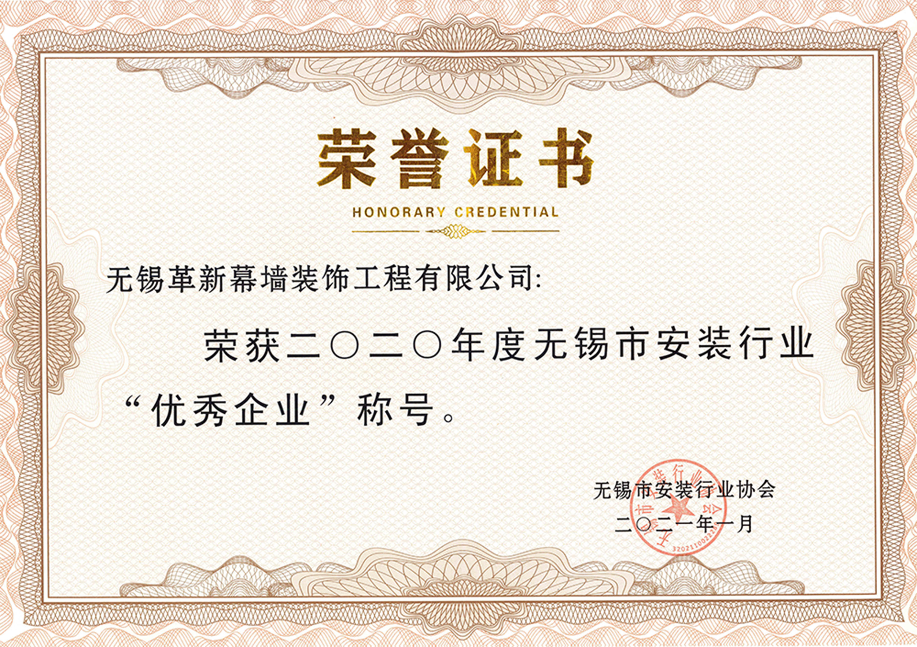 喜訊:熱烈祝賀我公司榮獲2020年度無錫安裝協(xié)會(huì)“優(yōu)秀企業(yè)”
