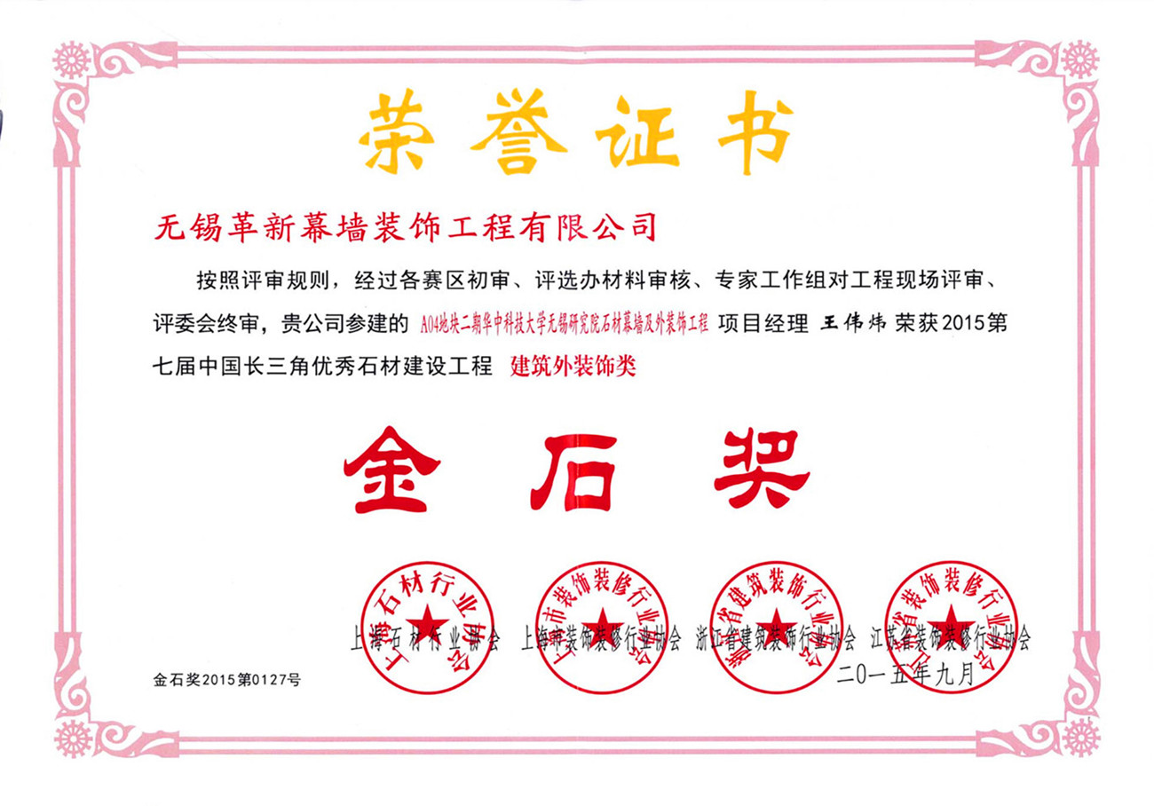 喜訊:熱烈祝賀我公司承建的華中科技大學(xué)無錫研究院石材幕墻外裝飾工程榮獲2015年第七屆中國(guó)長(zhǎng)三角優(yōu)秀石材建筑外裝飾獎(jiǎng)。